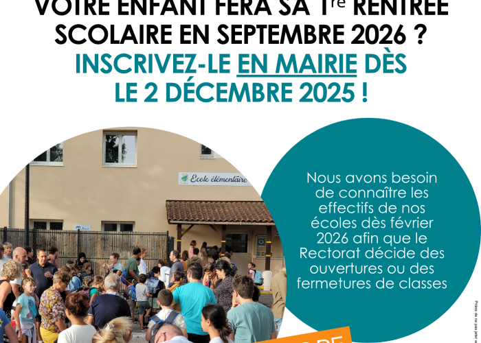 Les inscriptions des enfants entrant en 1ʳᵉ année de scolarisation pour la rentrée de septembre 2026 ouvrent en mairie à compter du 2 décembre 2025.