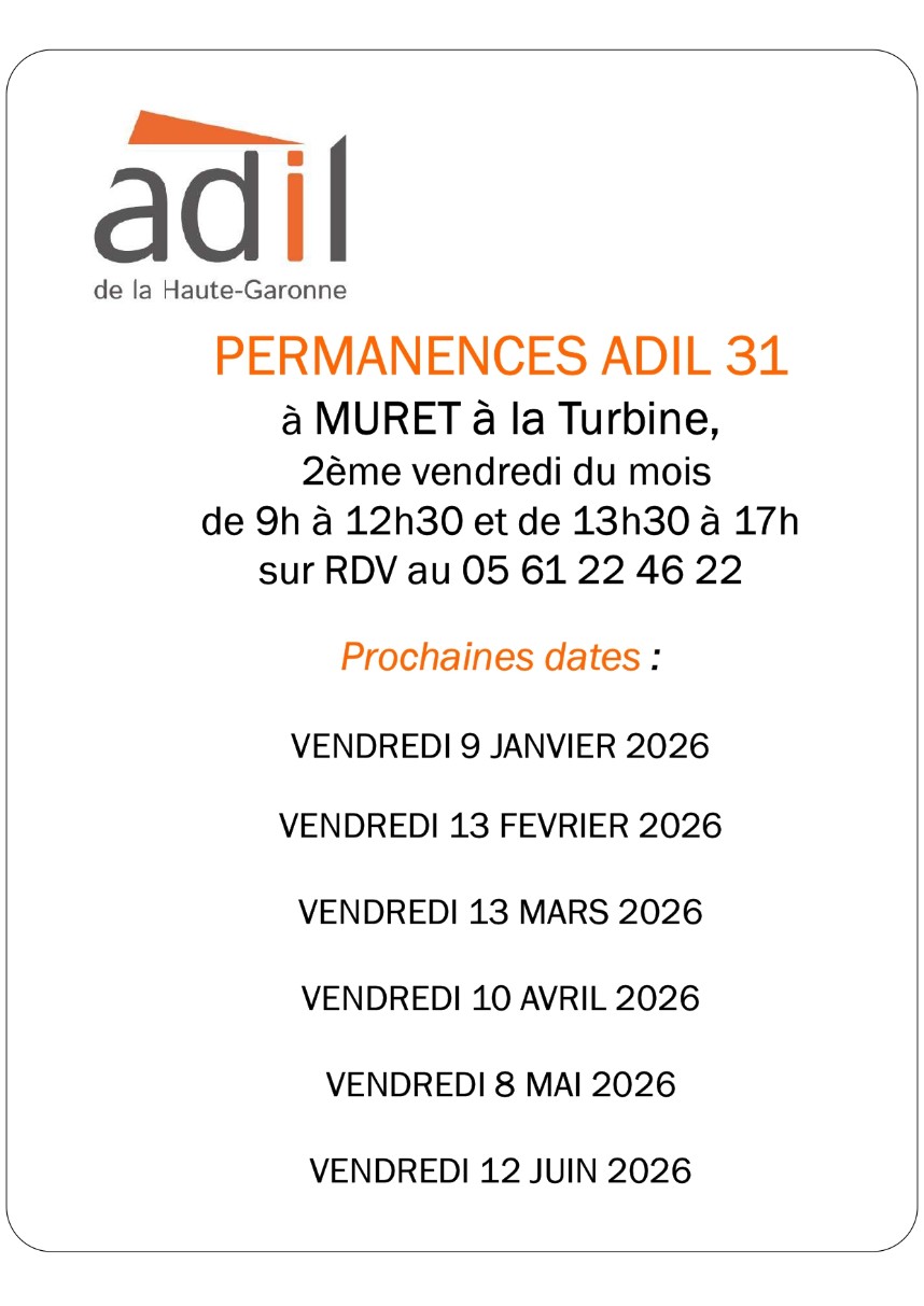 ADIL 31 : L’Agence Départementale d’Information sur le Logement vous apporte les conseils juridiques et financiers sur toutes les questions relatives au logement. Les permanences ont lieu tous les 2ème vendredi du mois de 9h00 à 12h30 et de 13h30 à 17h00 à la Turbine, 22 rue de Louge 31600 Muret.