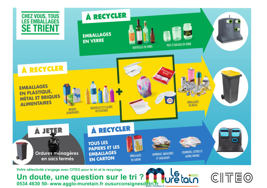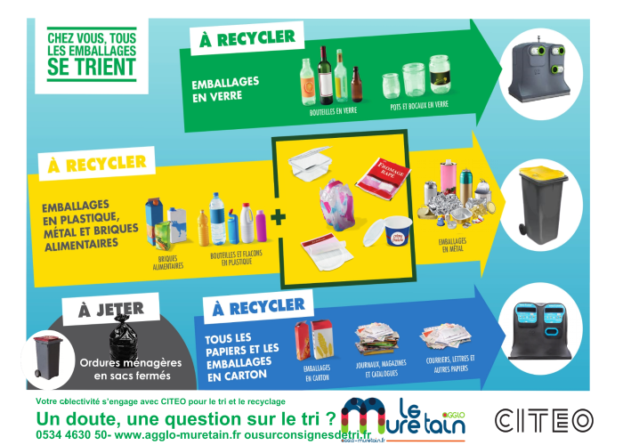 Déchets non recyclables → ordures ménagères (sacs fermés)
